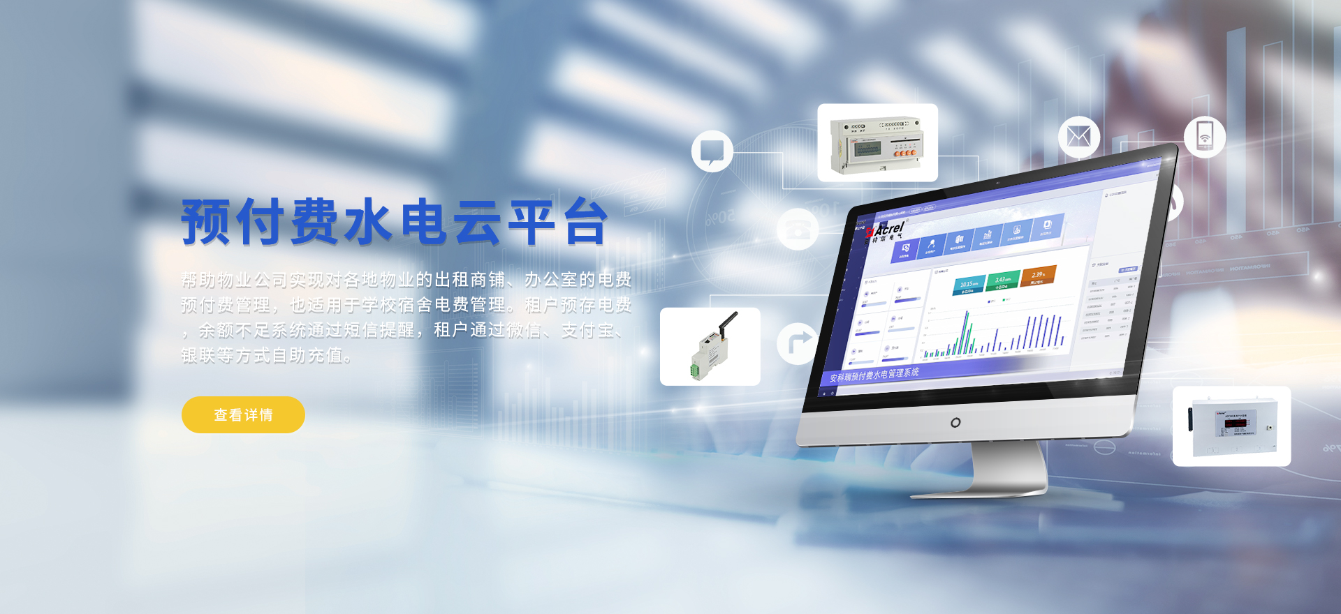 安科瑞提供的解決方案包括Acrel-EIoT能源物聯(lián)網(wǎng)云平臺(tái)變電所運(yùn)維云平臺(tái)安全用電管理云平臺(tái)環(huán)保用電監(jiān)管云平臺(tái)智慧消防云平臺(tái)能源管理云平臺(tái)、工業(yè)企業(yè)能源管控平臺(tái)、遠(yuǎn)程預(yù)付費(fèi)云平臺(tái)餐飲油煙監(jiān)管云平臺(tái)電動(dòng)汽車/電瓶車充電樁收費(fèi)管理云平臺(tái)、電力監(jiān)控/無線測(cè)溫系統(tǒng)、電能質(zhì)量治理系統(tǒng)、電氣火災(zāi)監(jiān)控系統(tǒng)消防設(shè)備電源監(jiān)控系統(tǒng)防火門監(jiān)控系統(tǒng)應(yīng)急照明和疏散指示系統(tǒng)、智能照明控制系統(tǒng)、醫(yī)用隔離電源絕緣監(jiān)測(cè)系統(tǒng)等,幫助用戶實(shí)現(xiàn)能源智能化、可視化、精細(xì)化管理,提高用能效率和用能安全,為企業(yè)節(jié)能降耗和實(shí)現(xiàn)能源數(shù)字化建設(shè)提供數(shù)據(jù)服務(wù)。